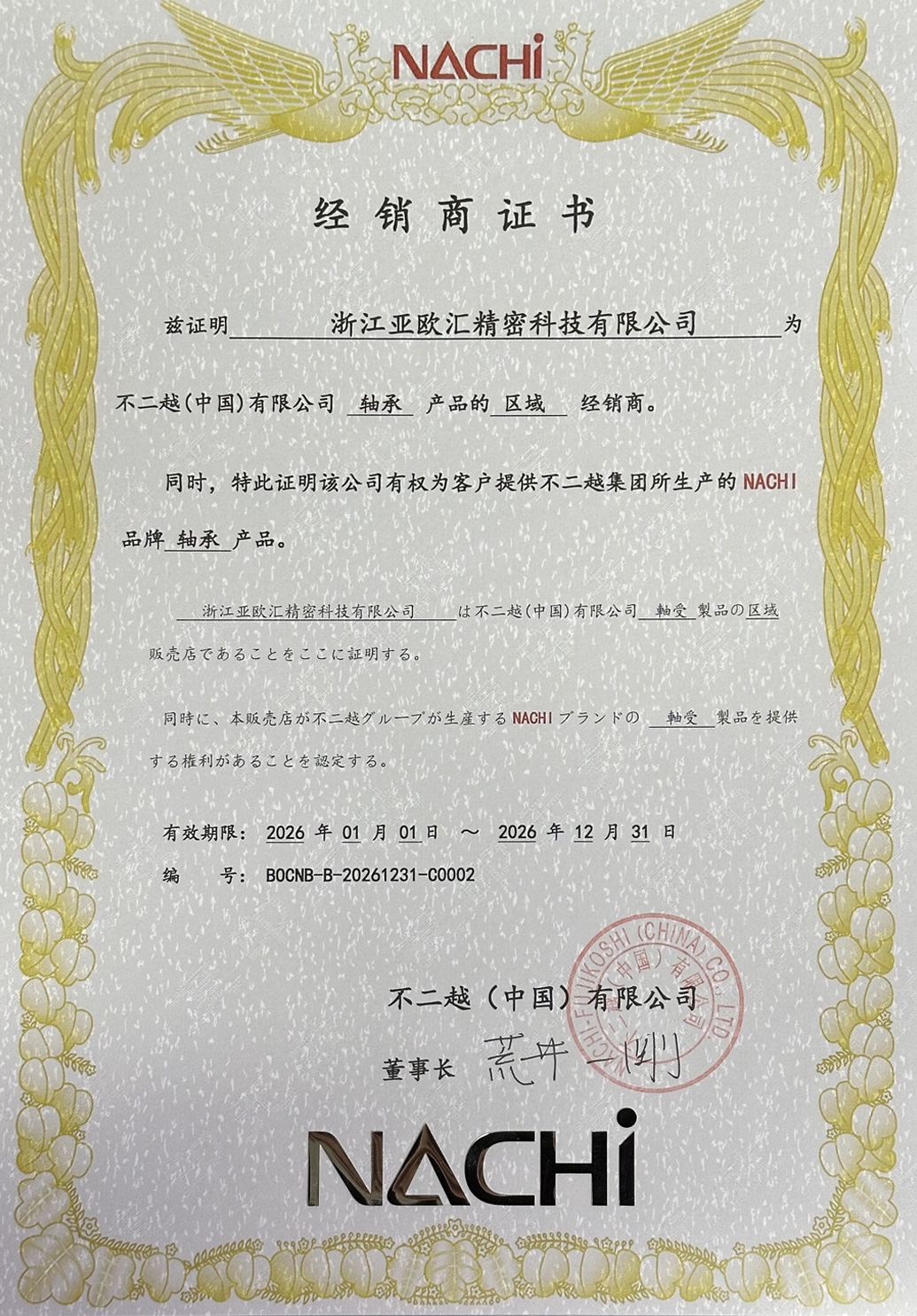 NACHI授權證書